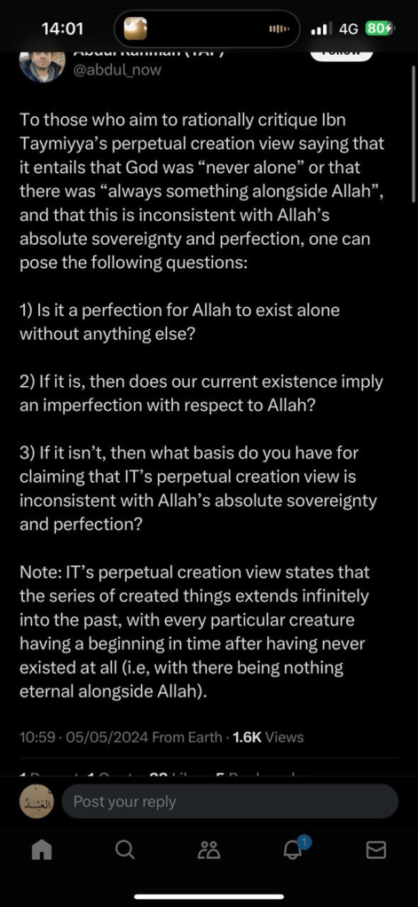 In the attached screenshot, we can see the brother questioning those who rationally critique ʾIbn Taymīyyaħ’s position on perpetual creation. Perpetual creation is a belief that entails Allāh has been creating in pre-eternity. He has always been creating. Never stopping. This action has always been happening.